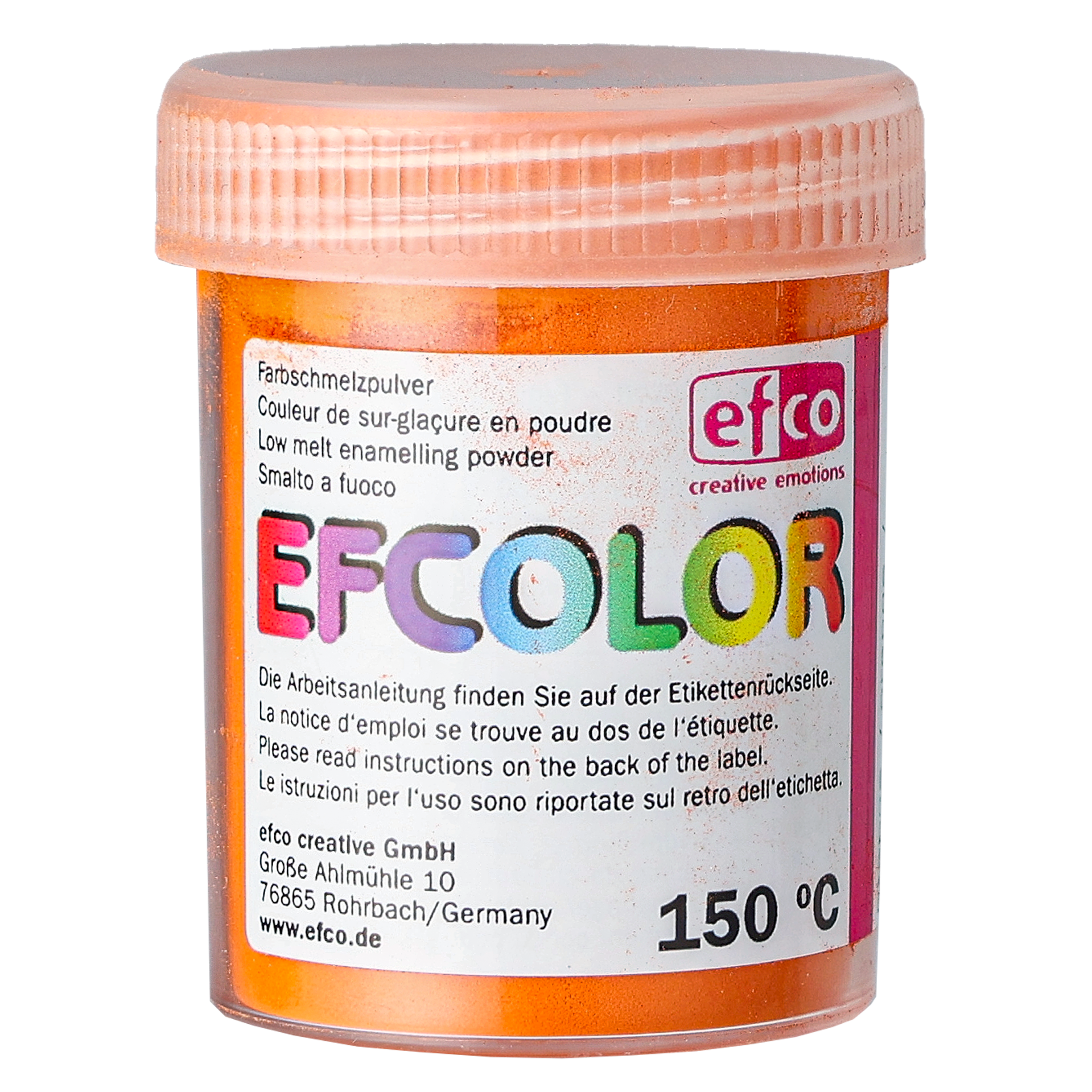 Efcolor er et bly- og kadmiumfrit smeltepulver, der giver en dækkende emaljering på metal, men som også kan anvendes på glas, træ, porcelæn, keramik, sten og FIMO-ler. Efcolor smelter ved 150 grader og kan derfor brændes i en ganske almindelig køkkenovn eller anden smeltestation. Sådan gør du: hvis overfladen er ujævn eller buet, påføres først emaljelim. Strø pulveret på gennem en emaljesigte. Placer din genstand på et brændestativ og lad pulveret smelte i højst 10 minutter. Når genstanden afkøles, størkner pulveret. 25 ml rækker til 8 dm2.