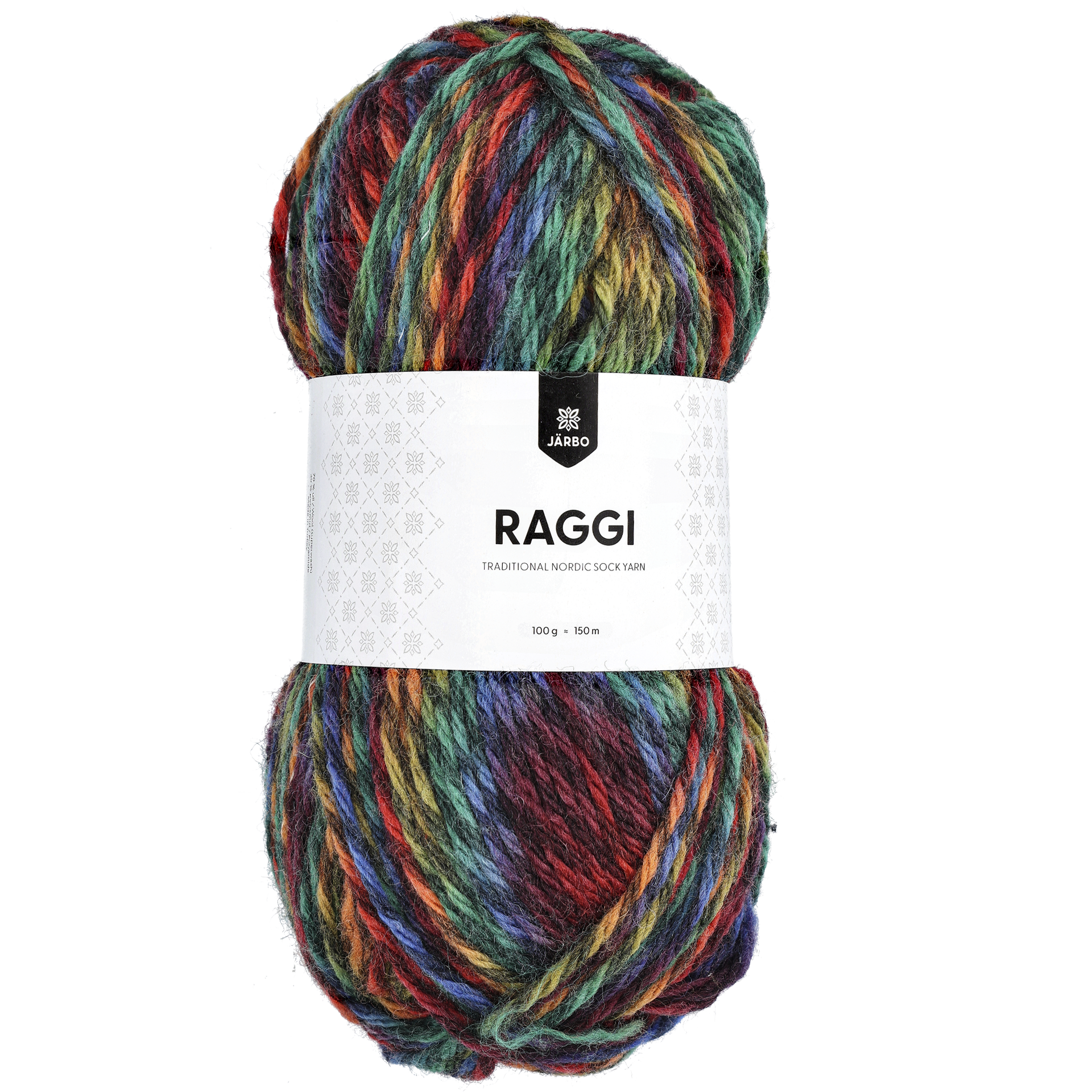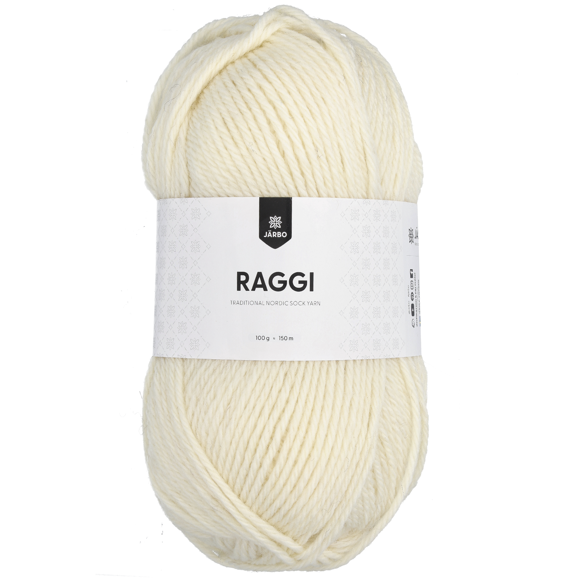 Järbo Raggi. Lanka 70 % villaa 30 % nailonia. Puikot nro 4 1/2 - 5. Silmukkatiheys 19 s = 10 cm. Konepesu 40° C. Sukille koossa 37-41 on menekki 150-200 g, M kokoiselle naisten paidalle on menekki n. 550 g lankaa ja lasten paidalle koossa 116-122 on menekki n. 350 g. Kerässä 100 g (n. 150 m).