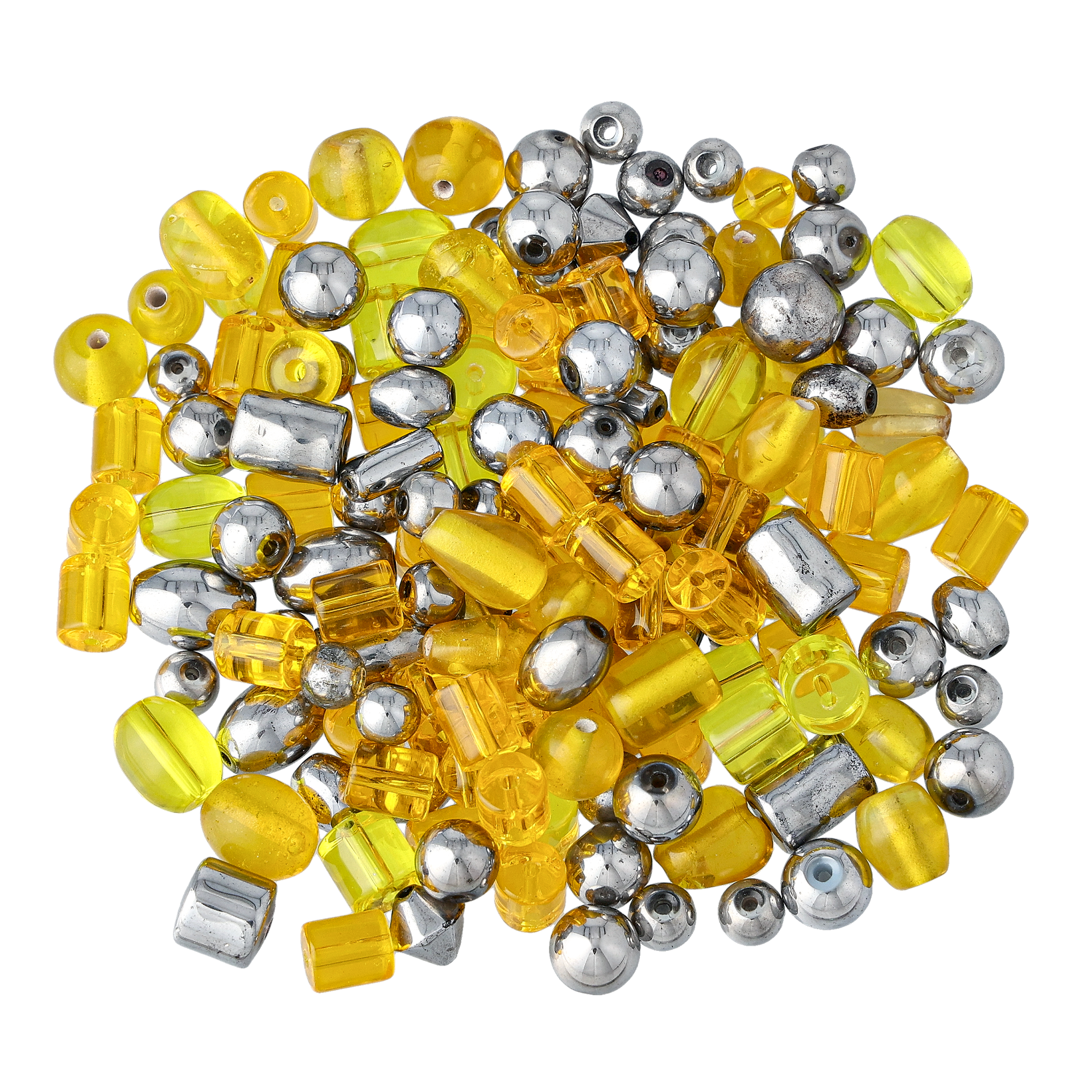Perlemiks Metall inneholder glassperler i ulike former, størrelser og farger. Posene inneholder sølvfargede glassperler og ser ut som de er laget av metall. Hver pose inneholder minimum 100 perler. Diameter hull: 1 mm.