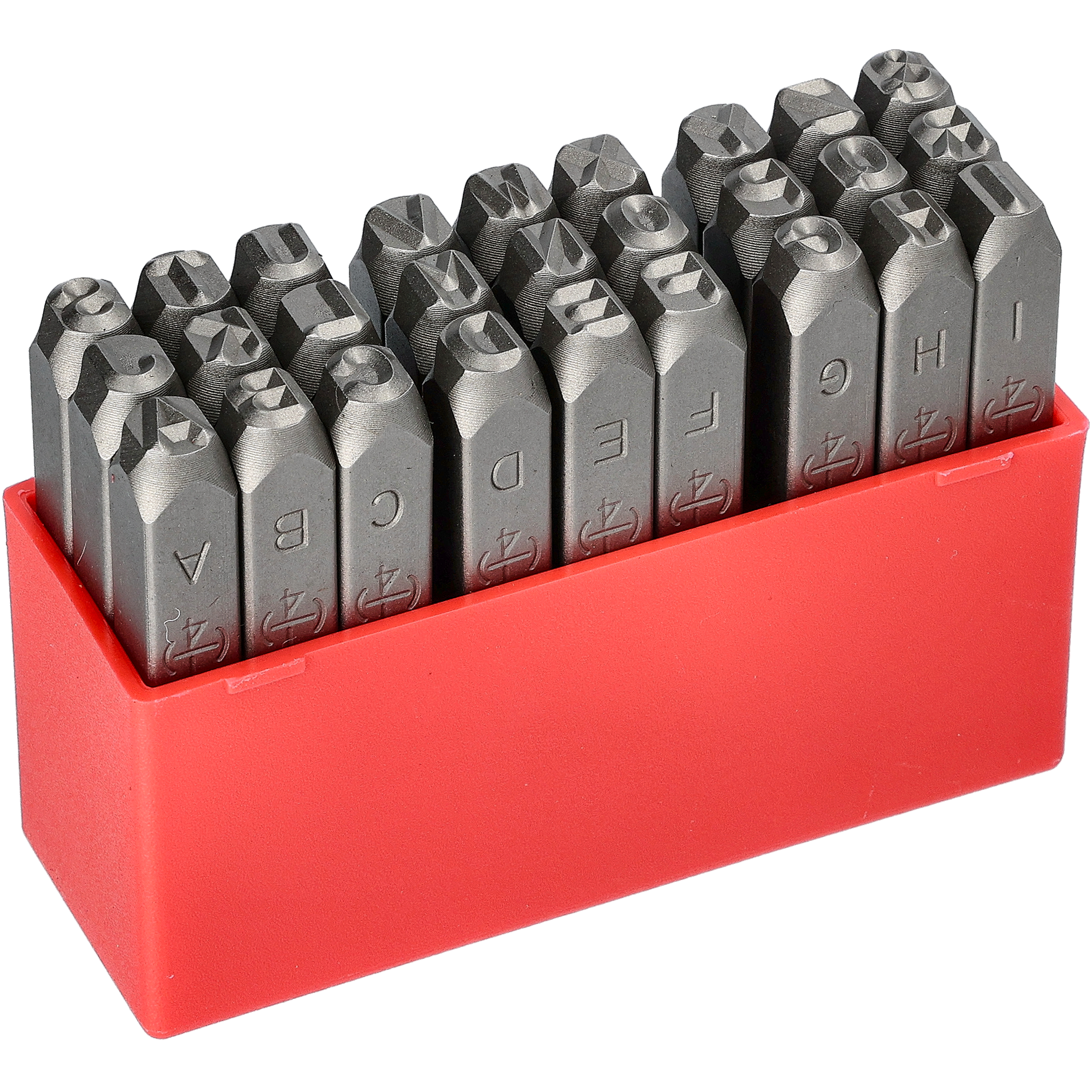 Bokstavstanser i herdet stål. Sett på 27 stk stanser A -Z samt &. Bokstavstansene egner seg til stansing og merking på stål og metall. Egnet verktøy er hammer eller plasthammer og miniambolt eller planeringsjern som underlag. Bokstavene er kileformede og lager større avtrykk jo dypere de blir slått ned i materialet. Oppgitte mål viser minste mål som er mulig å oppnå.