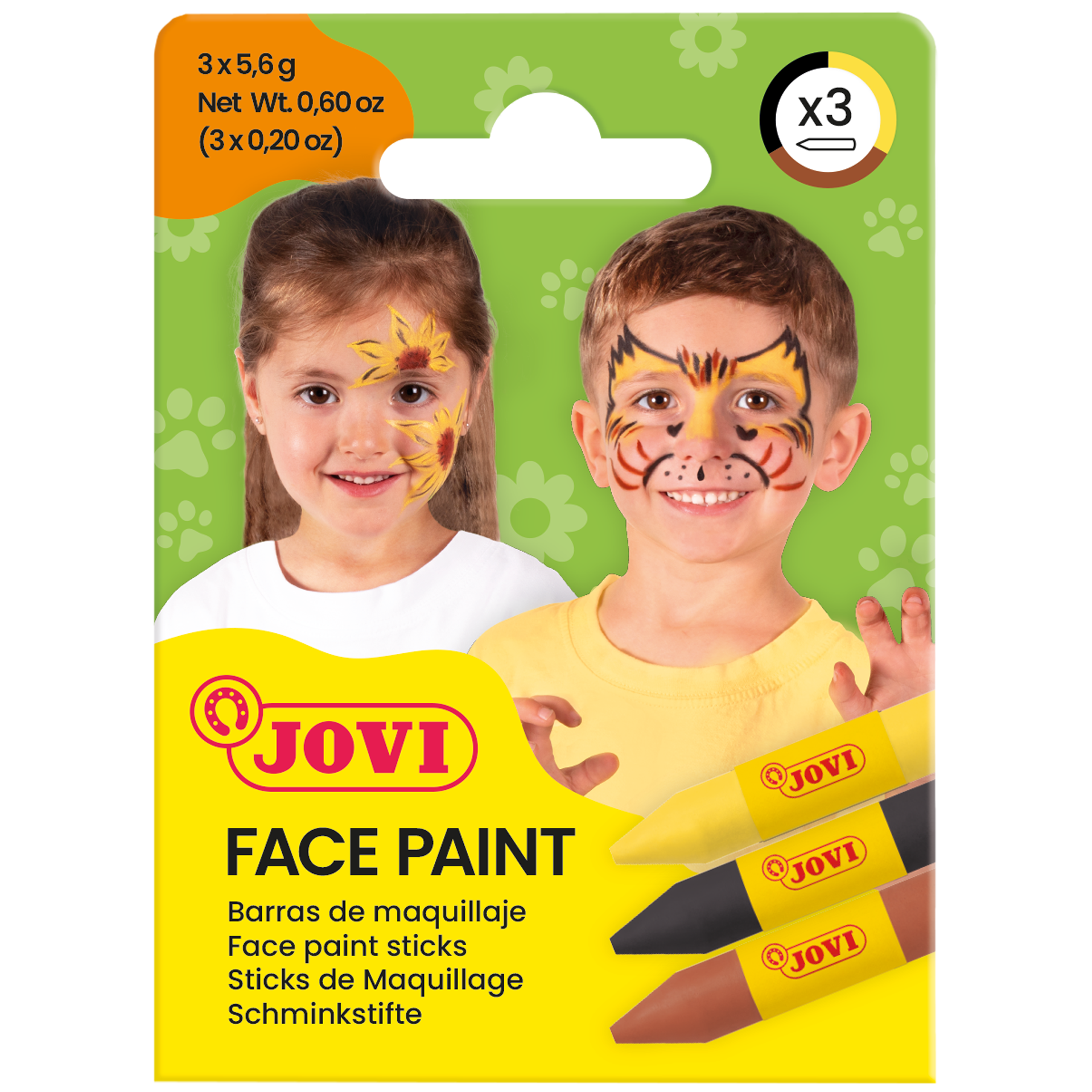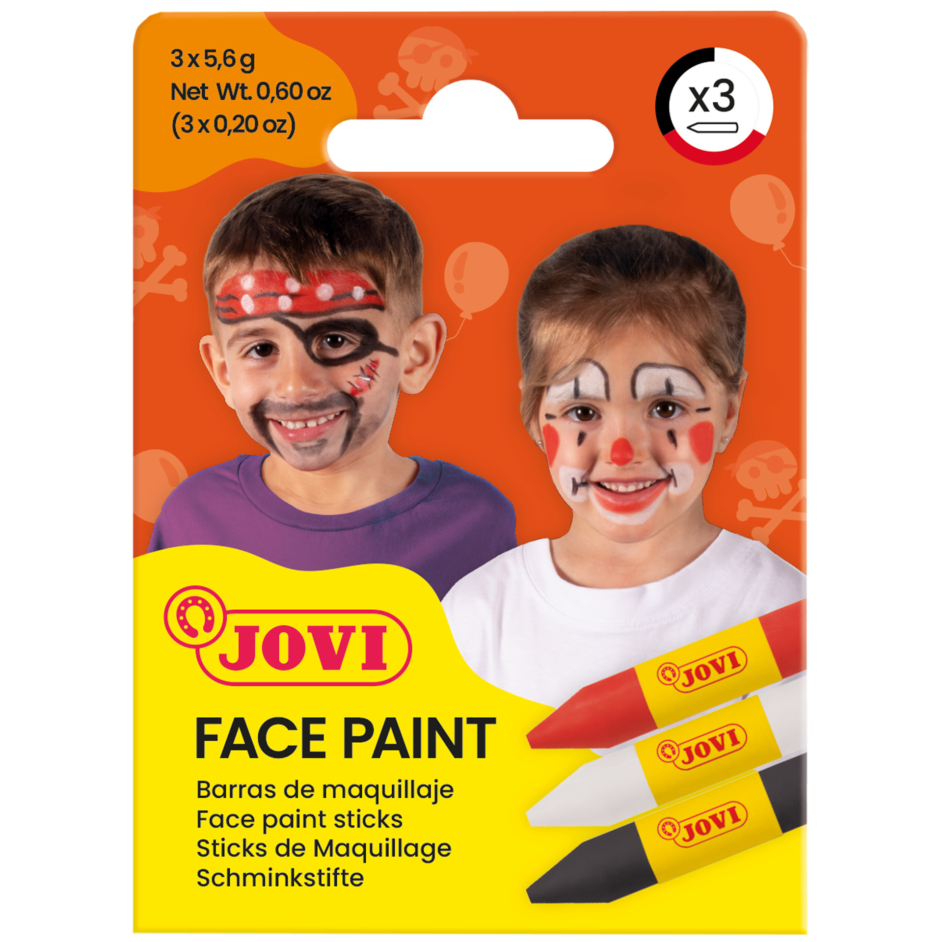Ansiktkritor i 3-pack med olika teman. JOVI:s ansiktsfärg är oljebaserad och hypoallergenisk. Ansiktsfärgen är lätt att applicera utan att använda vatten och den täcker bra. De starka färgerna är även inbördes blandbara så att man kan få en önskad nyans. Färgen är lätt att ta bort med en fuktad trasa och det mesta går bort utan tvål och vatten.